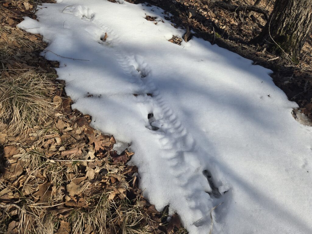 Taking advantage of the changing seasons, and feeling a need to stretch our legs, myself and the other Ney Naturalists headed down to the Minnesota River at the end of February — looking at trail conditions, gauging maple syruping equipment, and enjoying the sun. It was a bit of a muddy, mucky, adventure, but tracks in the melting snow were a real highlight of our day!