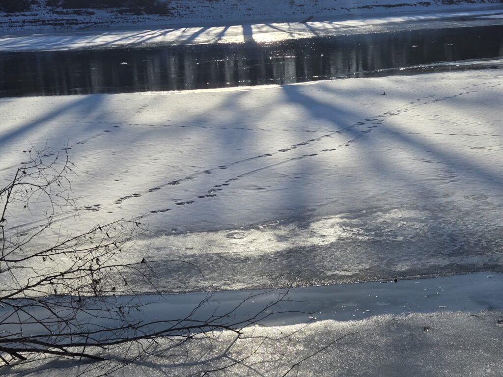 These raccoon tracks (left) ambling across the frozen Frog Pond are a great example of the different animal signs that can be spotted throughout the coldest months.